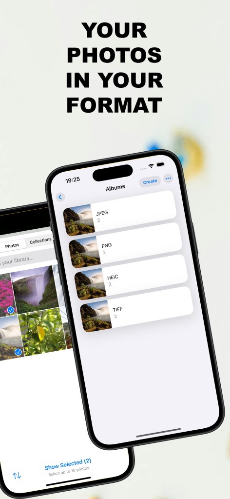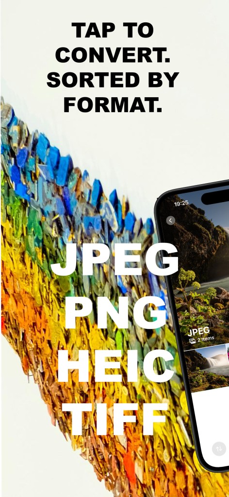 Choose up to 10 images, pick your format, and convert instantly to JPEG, PNG, HEIC, or TIFF. The app automatically organizes your results into dedicated albums — creating them only when needed — so your converted images stay tidy and easy to find.