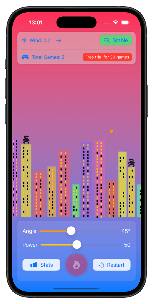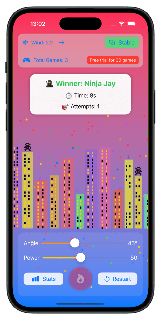 Challenge Cyber Shinobi in a turn-based duel where wind, gravity, distance, and precision determine who becomes the true master of the rooftops.