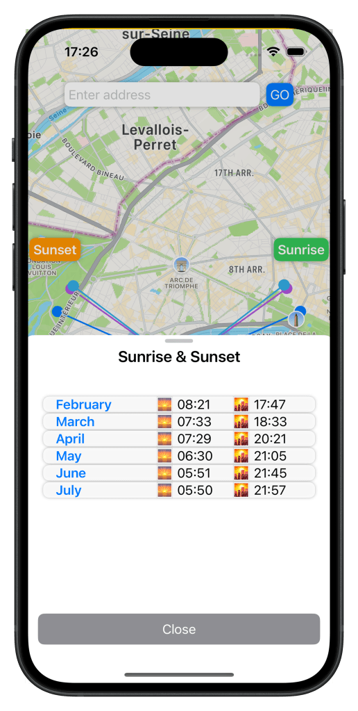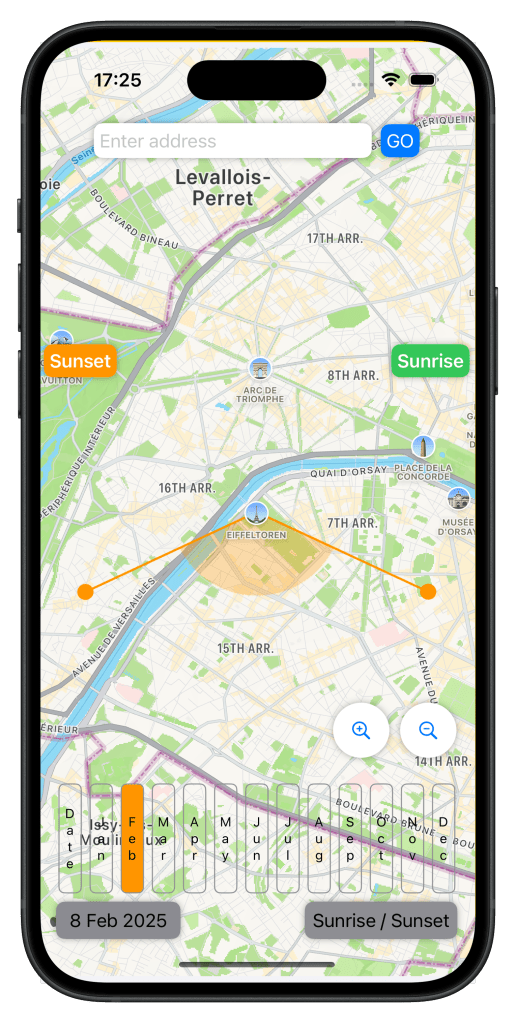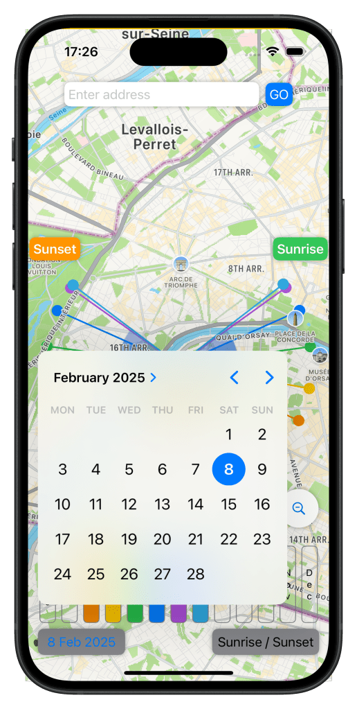 Move through the year, jump to any date and instantly see how sunrise, sunset shift across months and seasons.